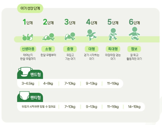 - 초신생아 (Preemie): 미리 태어난 아기를 위한 기저귀로, 체중이 약 1.8kg 이하인 아기에게 적합합니다.